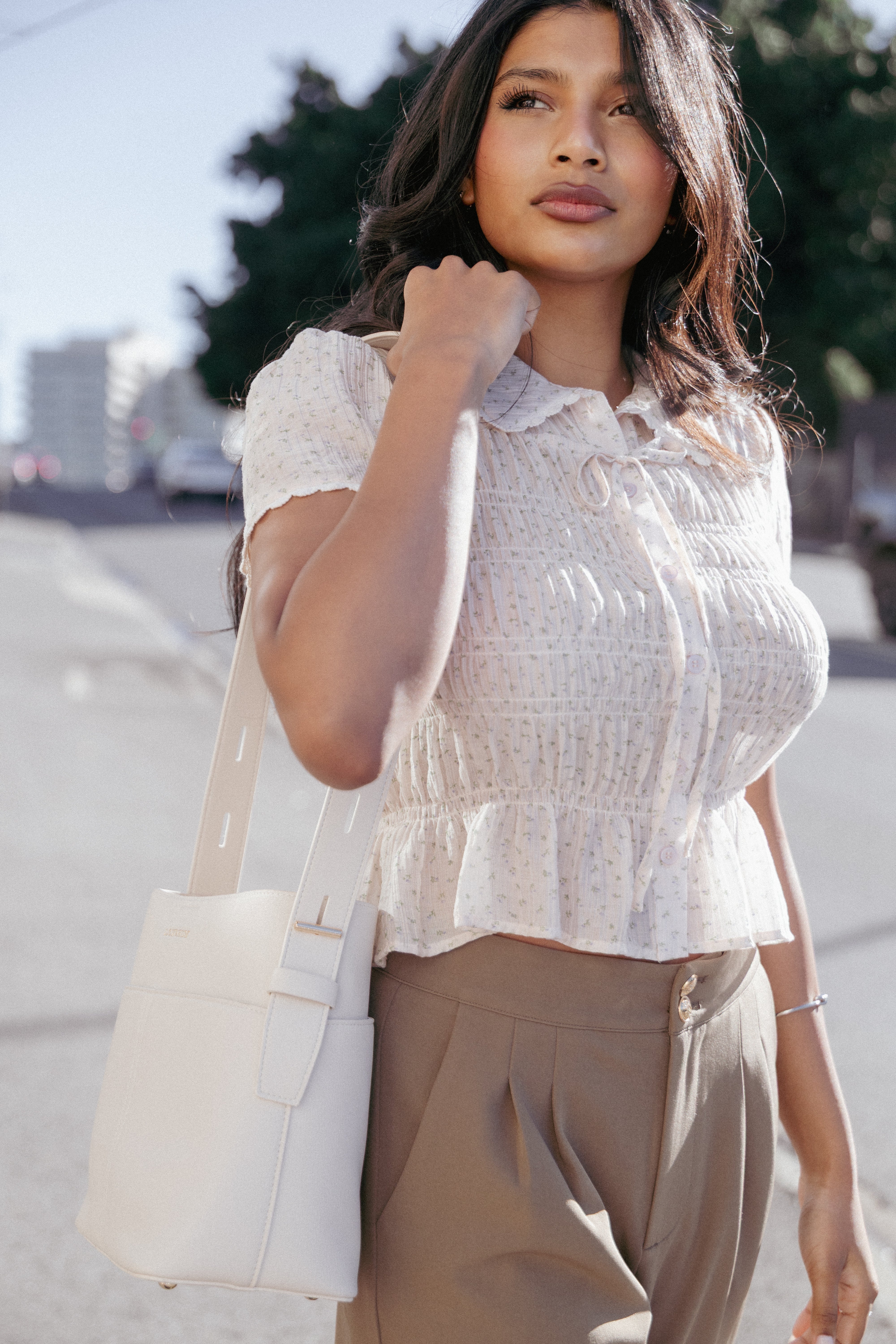 Add a pop of color and charm to your wardrobe with the Alima Shirred Top in Pink Purple Floral. Featuring a feminine spread collar and short sleeves, this top brings effortless style to any outfit.