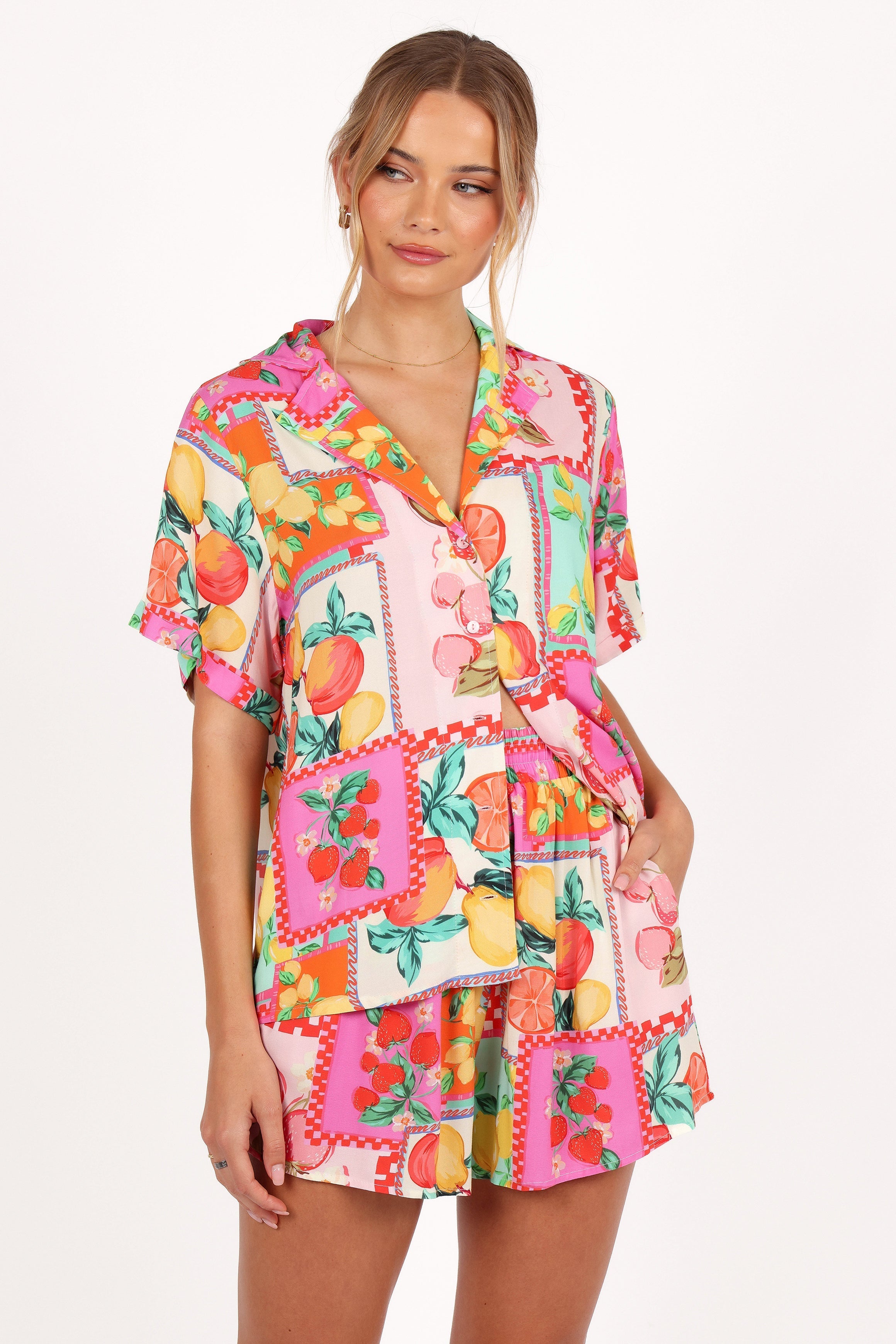 Heading on vacation? This top and shorts set is perfect for making a statement while relaxing in the sun! The top features a v neckline, spread collar, short sleeves, and functional button down front.